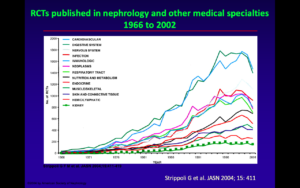 Indeed, in the pre-millennial decades there appears to have been a relative void or pause in the focus on patient care at a strategic, specialty level. This can be seen as a consequence of the dominant effort to quantify demand for treatment and press for extra resources. Such opportunity costs are only too easy to neglect, especially when the bread-and-butter pursuit of the ideals of renal research in bi-annual ‘scientific meetings’ had also to be sustained. Concern for the momentum of the very strong academic traditions of Nephrology arguably absorbed some of the available medical attention, evidenced by a revealing survey of renal research in academe (1989-93).2 A specialty deficit in RCTs was well recognised.33
